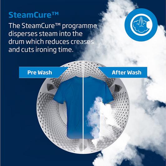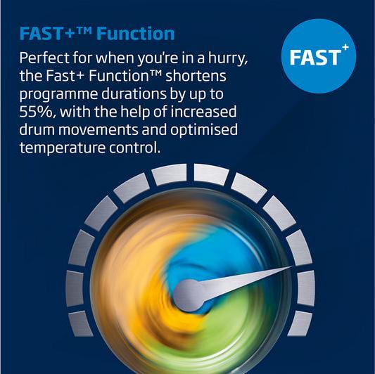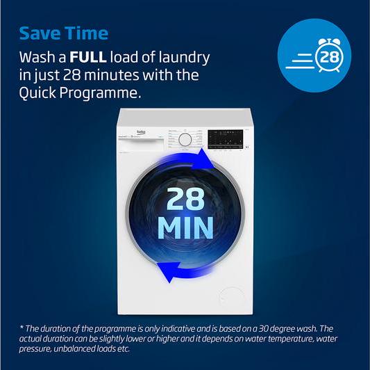 This Beko washing machine makes doing the laundry way less of a chore. The IronFast feature uses steam to reduce creases by up to 50%, so you spend less time leaning over the ironing board. When your dirty laundry pile is stacking up, the Quick program can blitz through a 9 kg load in under 30 minutes. That pile will be less mountain and more molehill in no time. AquaTech halves wash times while still taking good care of your clothes. The water and detergent cascade down like a sudsy snowstorm so the drum doesn’t have to rotate as much. And EnergySpin uses clever drum movements to dissolve detergent more effectively and earlier in the cycle. You can save up to 35% on all your everyday wash cycles without skimping on the clean.Good to know- EnergySpin dissolves detergent more effectively and earlier in the cycle so it uses less energy- The RecycledTub is sustainably made from recycled plastic bottles- Missing a sock The interior light lets you see whether you’ve left any rogue items behind when unloading- Download the HomeWhiz app on your phone and take control of your machine from anywhere