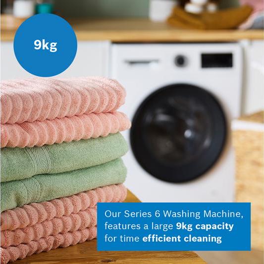 Want to spend less time getting a perfect wash This Bosch Series 6 washing machine has a SpeedPerfect option that cuts washing times by up to 65%. Better still, it can can be used with most programs. If you’re running late to office, the Super Quick feature will wash your clothes in as little as 15 minutes so your weekday mornings aren’t as rushed. What’s more, if you ever miss a sock or scarf while you’re sorting the load, use the Reload function to add it and the wash will continue from where it left off.nGood to know – Thanks to its AntiStain feature, the most common and stubborn stains will vanish easily – Iron Assist gently steams your freshly washed clothes to make those wrinkles disappear – The ActiveWater Plus technology uses sensors to use just the right amount of water and cut down on waste – The EcoSilence Drive runs super quietly, so it won’t annoy you with loud cycles