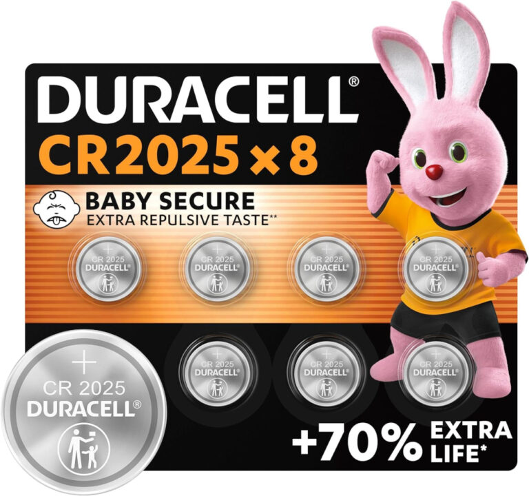 DURACELL 2025 Lithium Coin Batteries 3V (8 Pack) – Up to 70% Extra Life – Baby Secure Technology – For Use in Key Fobs, Fitness Watches and 3D Glasses – Baby Secure Packaging