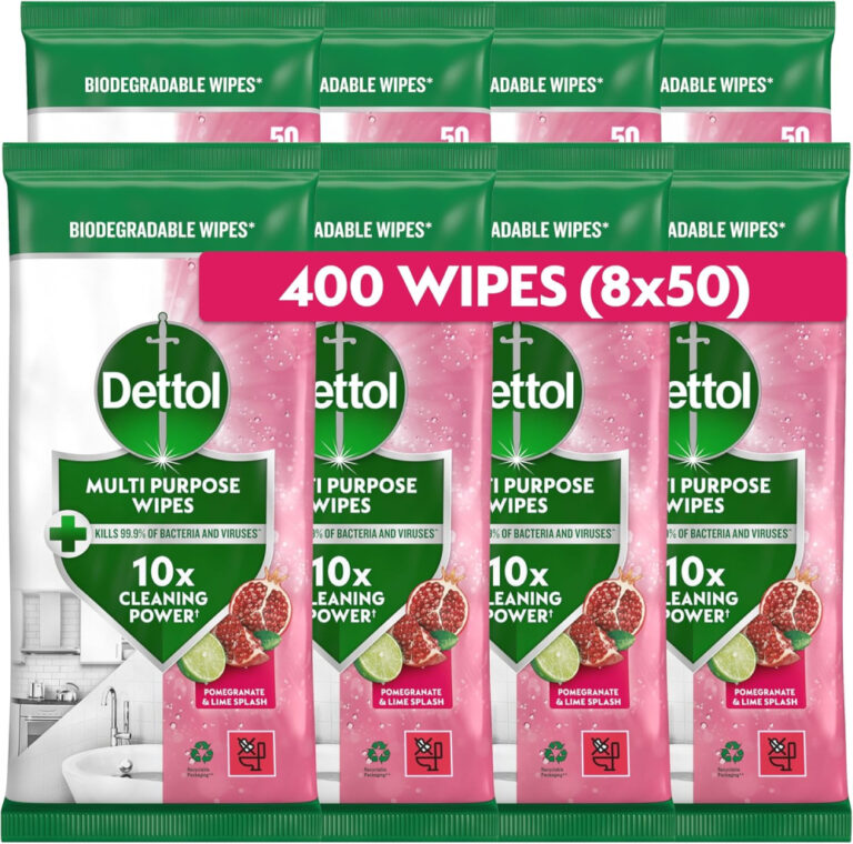 Dettol Antibacterial Multipurpose Cleaning Wipes, Pomegranate & Lime, 400 Wipes (50 x 8pck) Disinfectant, Biodegradable, 10X Cleaning power vs Water alone, Kills 99.9 Percent of Germs