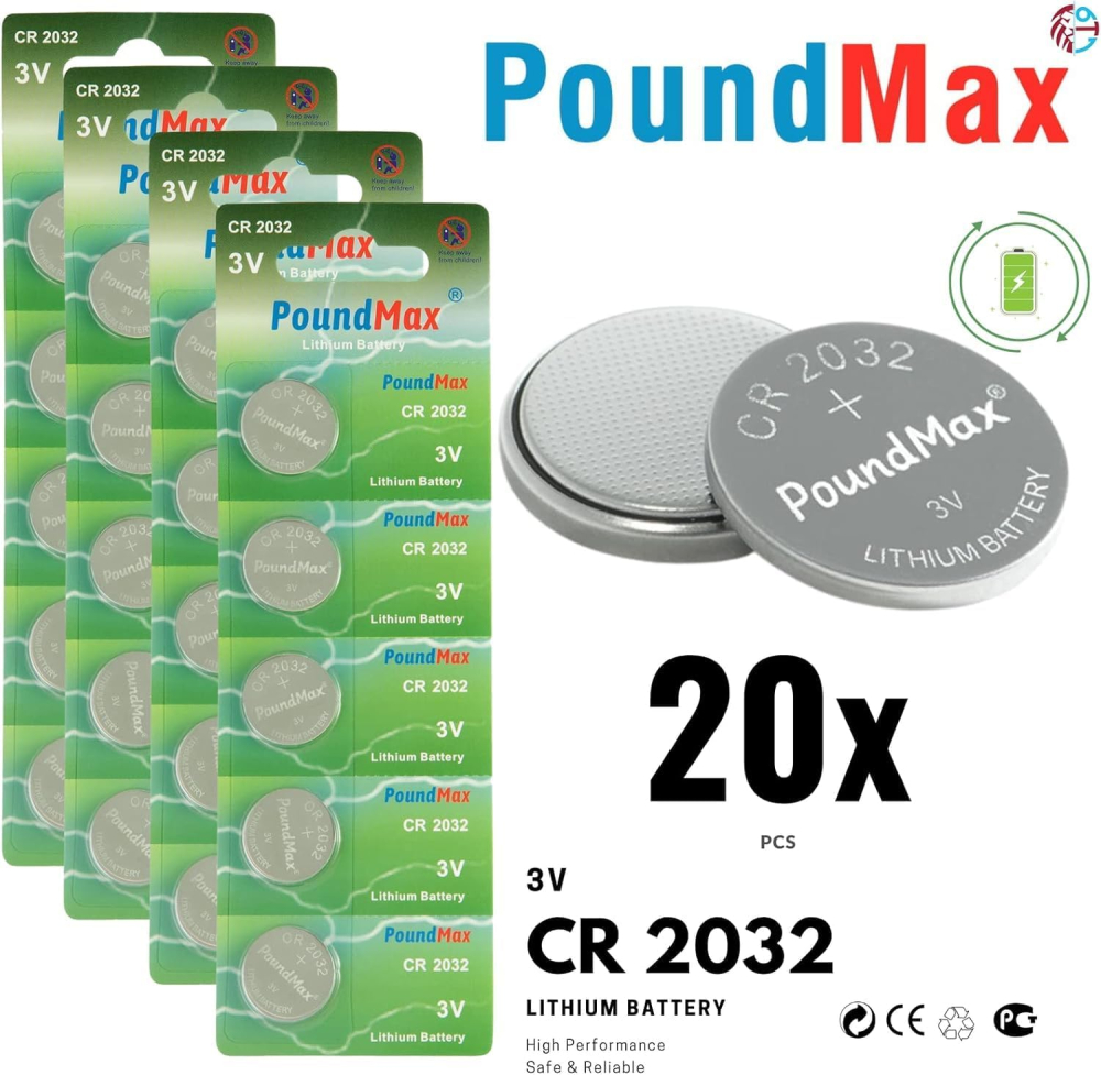 PoundMax 20-Pack CR2032 Lithium Coin Cell Batteries: Ultra-Reliable 3V Power for Key Fobs, Fitness Trackers, and Smart Devices (DL2032, ECR2032 Equivalent)