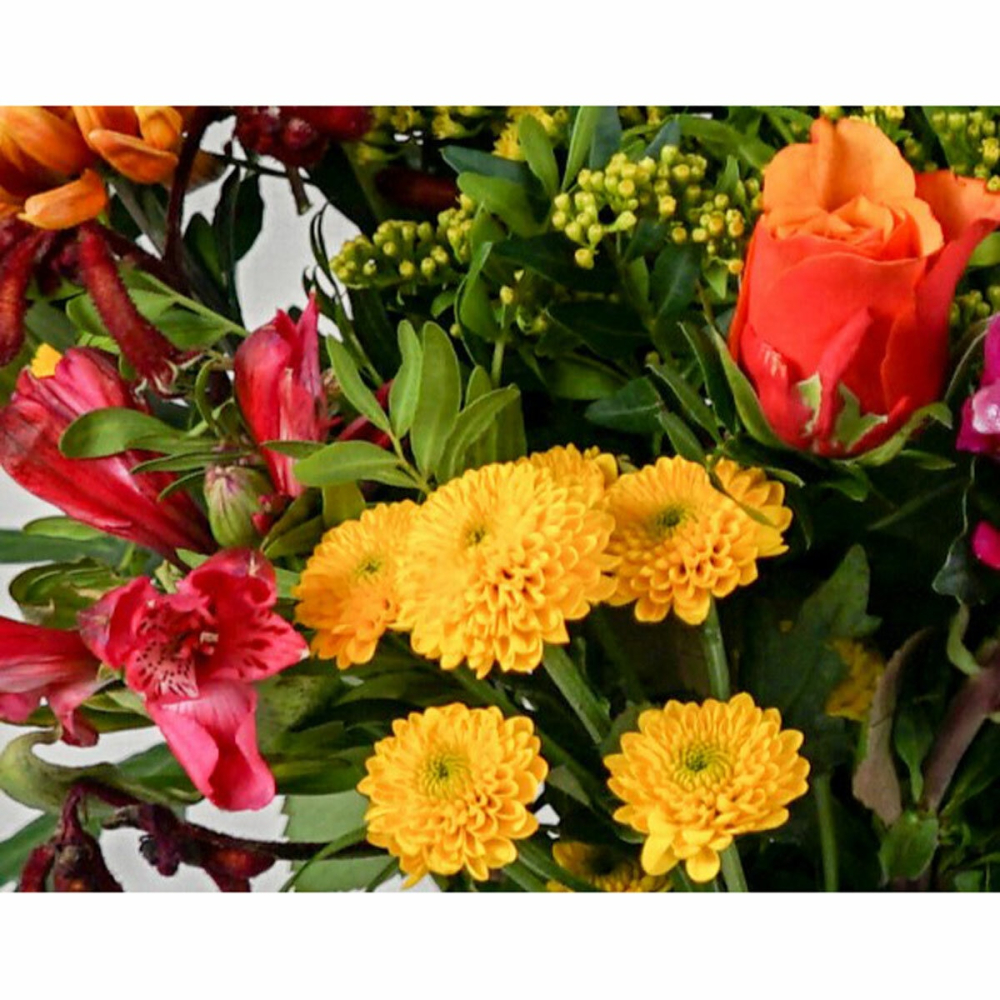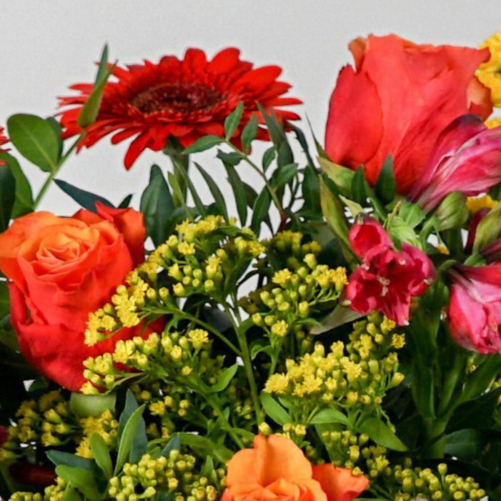 - Vibrant Autumn Colors: Features a stunning seasonal mix of flowers in rich reds, oranges, and yellows that perfectly embody the fall harvest.