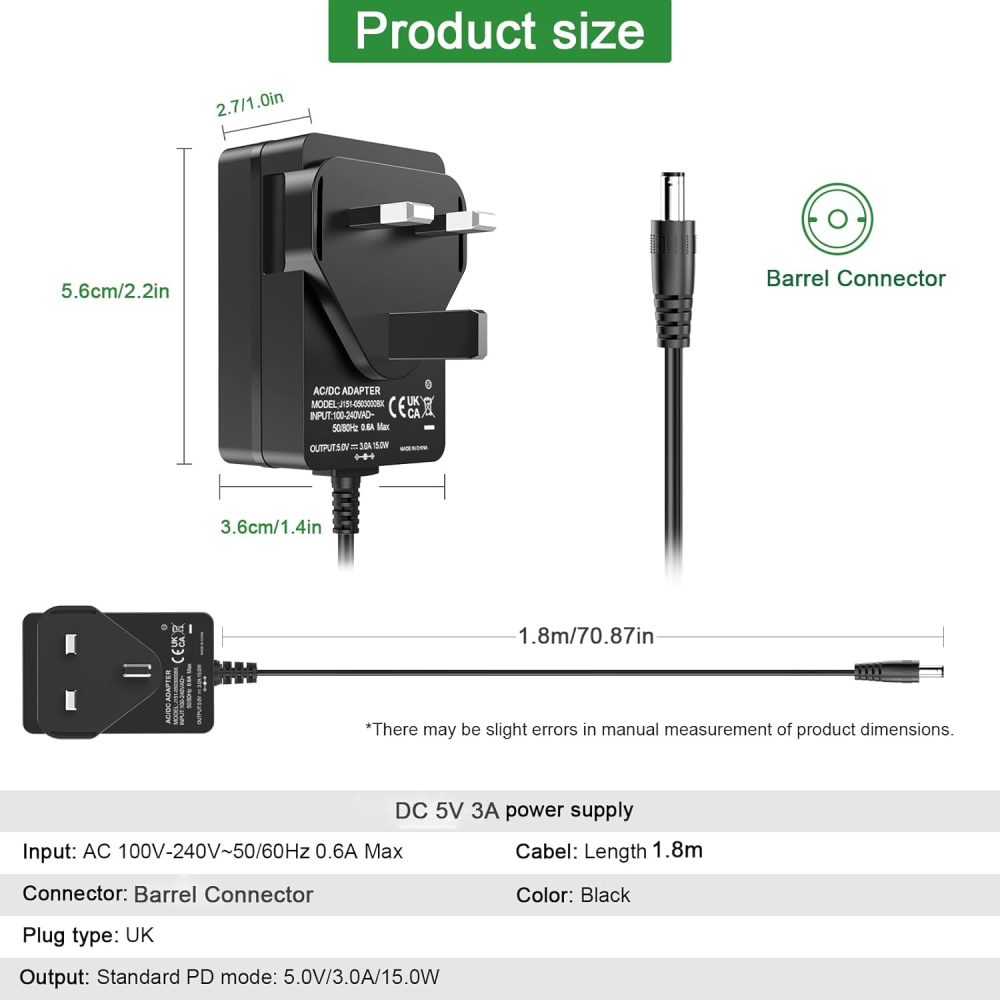 This 5V 3A power supply may sound like a niche product, but it’s quietly brilliant if you’ve got the right kit to match. I used it for a DIY lego model lighting kit project, chopping off the plug and wiring it up with USB connectors—don’t worry, it didn’t end in sparks or regrets. Everything works perfectly, and the adapter stays cool, which is always a bonus when you’re plugging in multiple devices.The lead exits from the top of the plug, which might annoy anyone with a tidy-cable obsession, but for me, it’s a non-issue. At £12.34, it’s good value compared to buying multiple USB plugs and cables. Just double-check your device specs—it’s strictly 5V only.Pros:- Reliable power output with no overheating.- Good value for money at £12.34.- Versatile for compatible devices or DIY projects.- Includes short circuit and flame-retardant protection for safety.Cons:- Cable exits from the top, which could be awkward in some setups.- Strictly for 5V devices—double-check compatibility.Final verdict: A practical, no-nonsense adapter that does what it says on the tin.