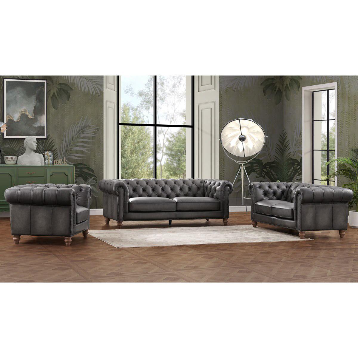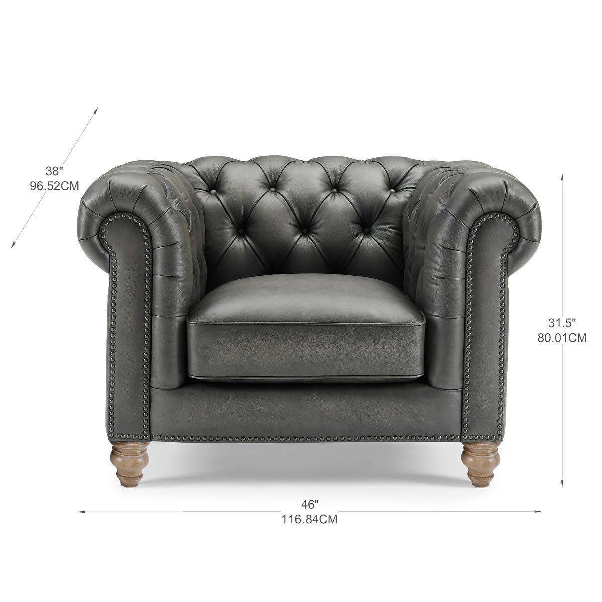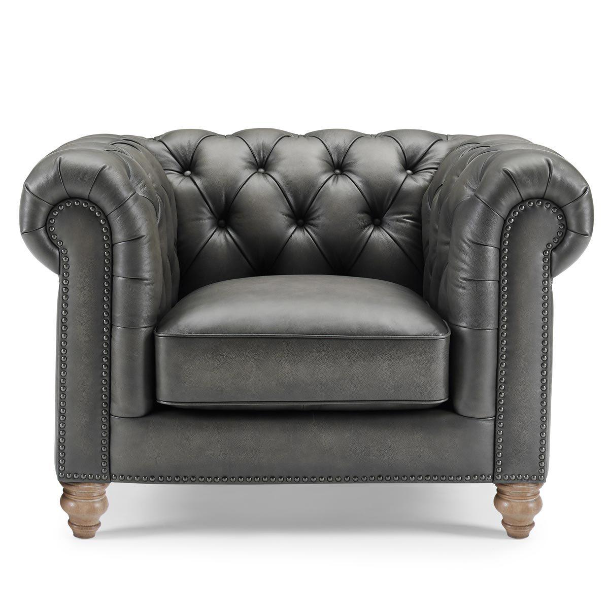 The Allington Chesterfield Sofa collection showcases traditional hand-tied buttoning on the back and arms and each is handmade by skilled craftsmen. The stately pewter nail head trim is hand applied and intricately outlines the arms and front rails, adding the perfect finishing touch to this exquisite piece. With its kiln-dried, solid wood frame, this armchair is covered in hand-rubbed, top grain vintage leather on all seating areas and arm rests, with split grain leather on the front rail, sides and back. The Allington Chesterfield Armchair has generous seating space and is constructed to stand the test of time.