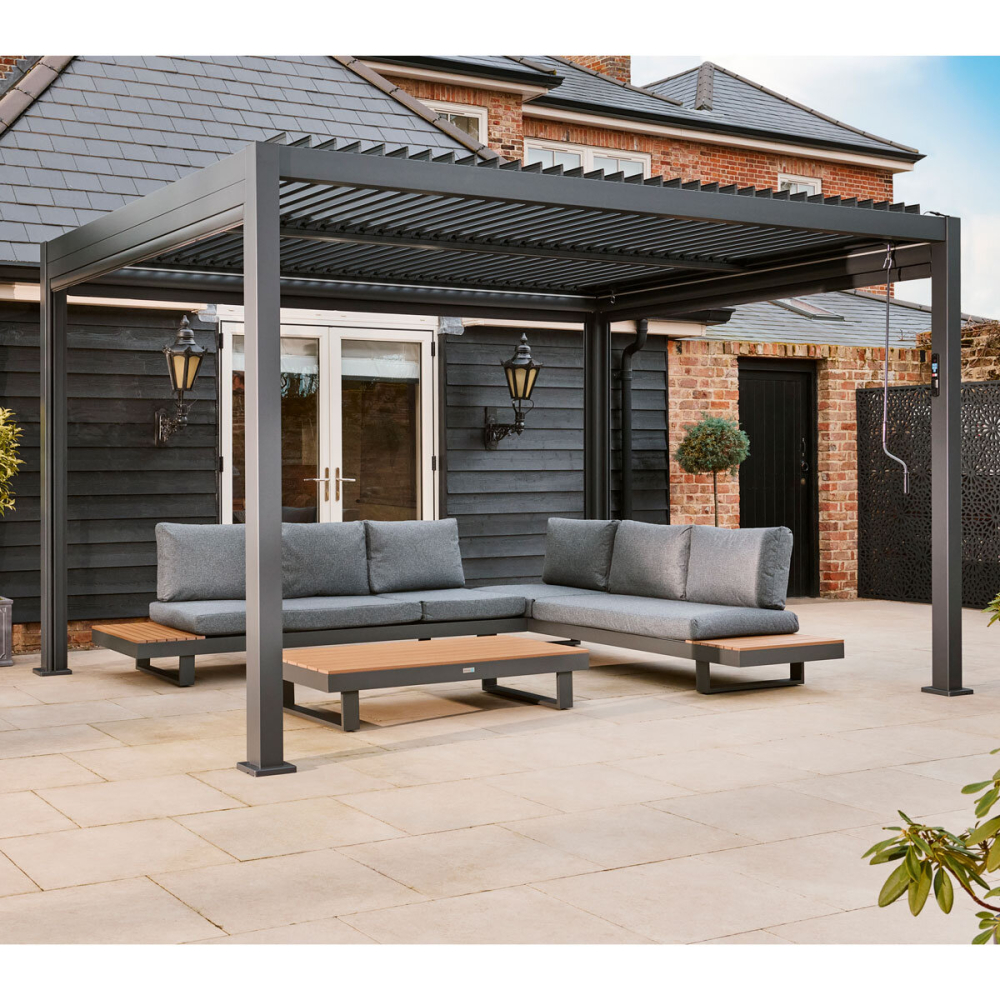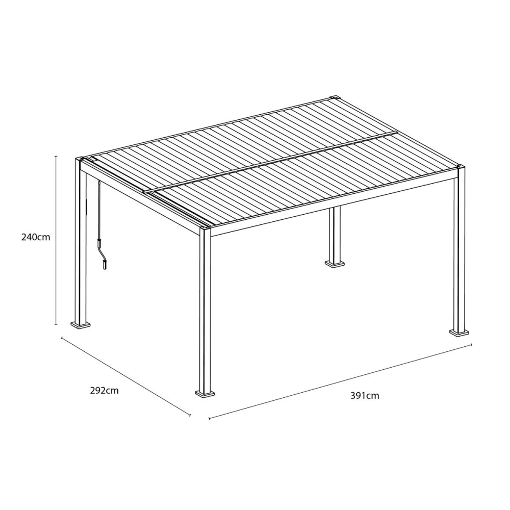 - Split louvered roof design allows for precise, manual control over sunlight, shade, and rain protection.