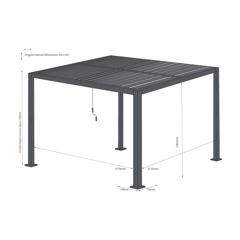Very pleased with this purchase, good quality parts, good courier and delivered in 6 boxes. Fairly straightforward to assemble but you do need help to get the roof on. The louvered roof is great with the option to open/close. Rainwater runs off into the integral channels and down the inside of the legs. Couldn’t find the roof winder (apparently it was inside one of the legs and as I already built it I rand the the supplier and they sent a spare. I also sourced an extra 4th blind on-line separately.