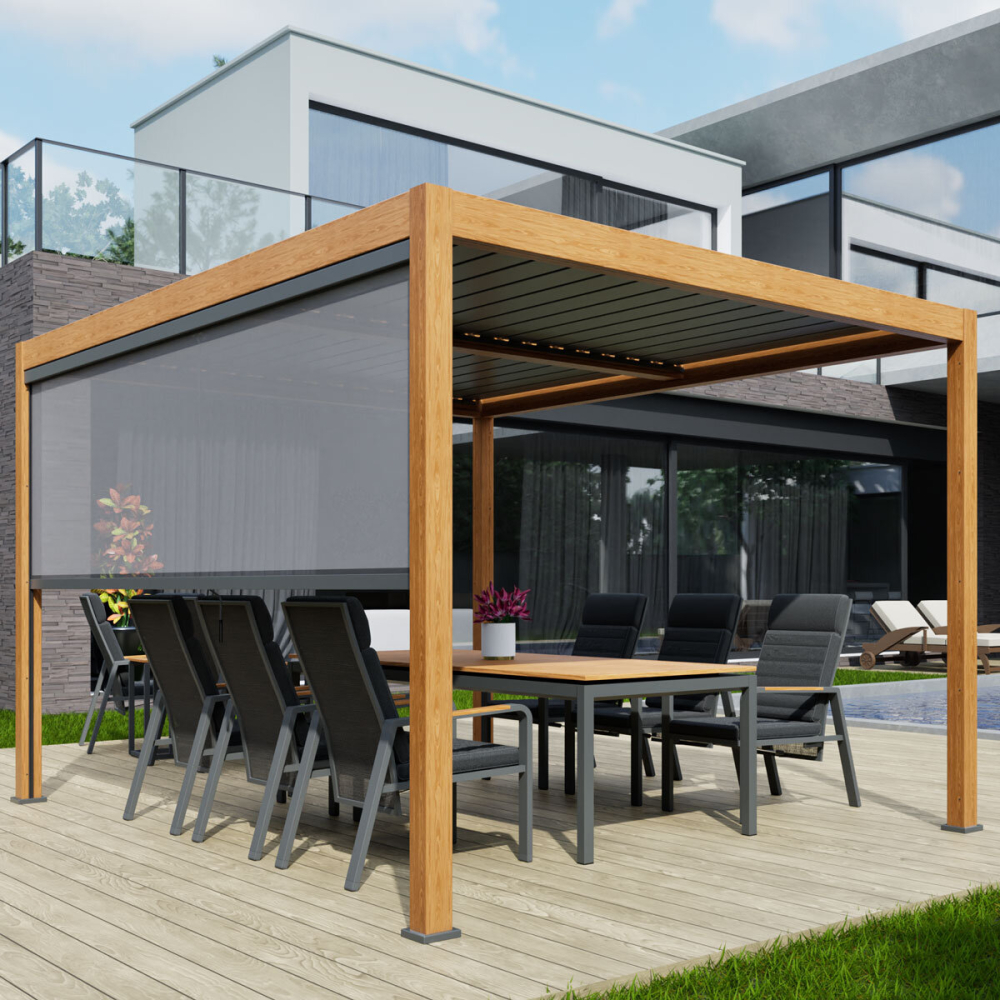 Alvivo 9ft 8″ x 13ft 3″ (3 x 4m) Wood-Look Louvered Aluminium Pergola Bundle with 3 Pull-Down Screens