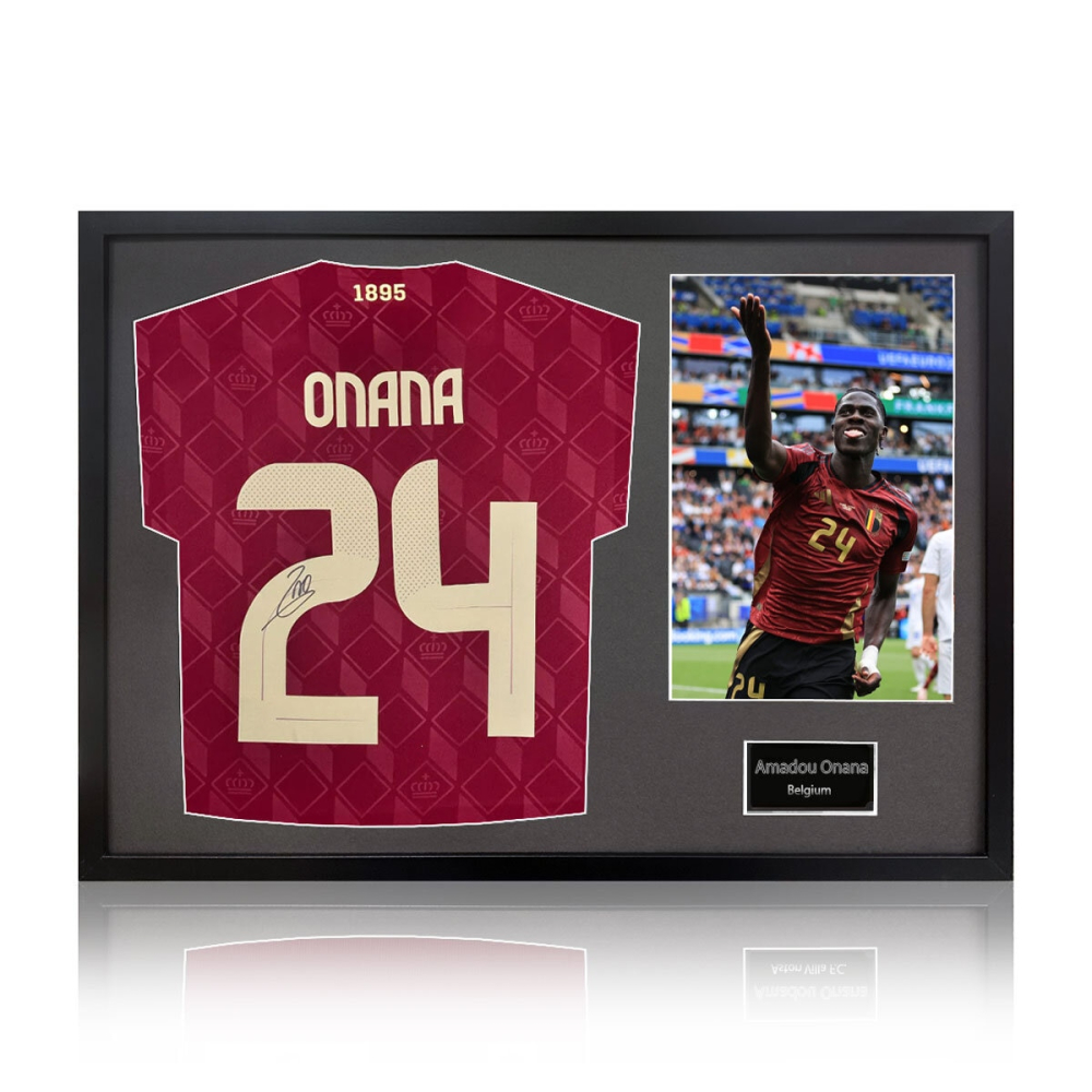 Own a Piece of History: Amadou Onana Signed Framed Belgium Football Shirt – Authentic Memorabilia with Photo Display