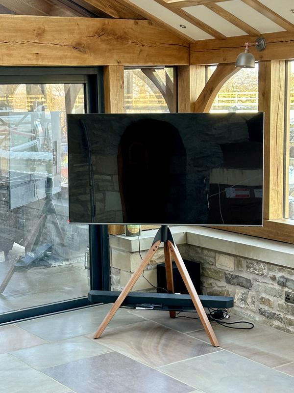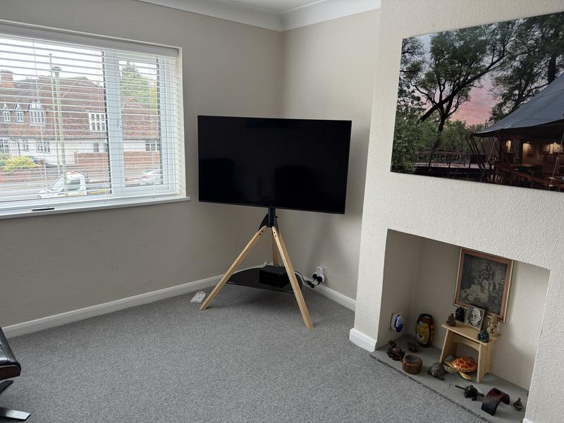 Very happy with this stand. Very solidly made and the finish is excellent. Good range of adjustment for the TV mount. I fitted a 55” but would be confident that a larger screen would be well supported. Feels very sturdy.