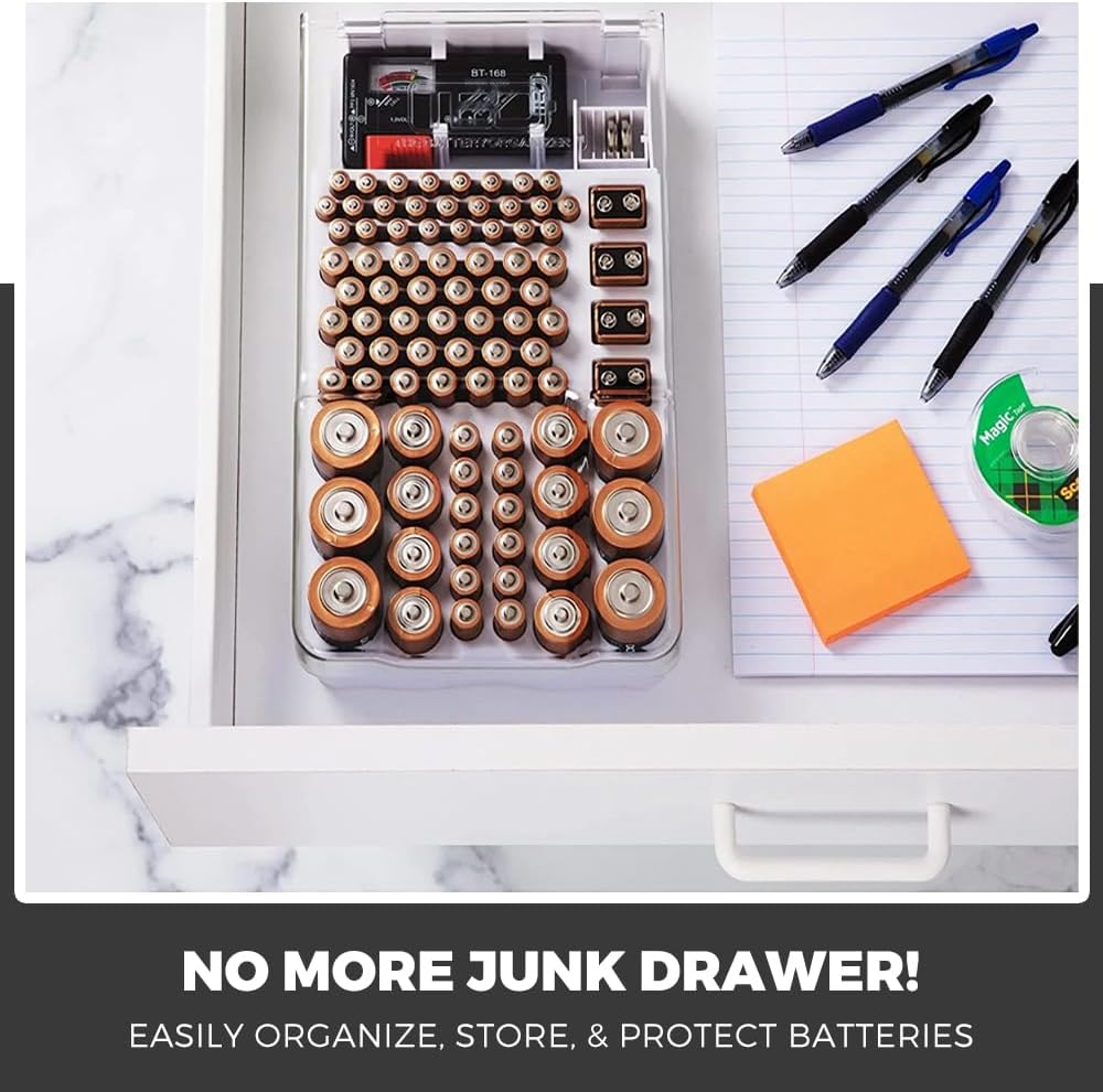 The ultimate Battery Storage Case and Organiser is the essential solution for minimizing clutter and maximizing power reliability. This large capacity Batteries Box safely holds up to 93 AAA, AA, C, D, and 9V batteries and includes a built-in Battery Tester to instantly check battery health, ensuring you always have reliable power when you need it.