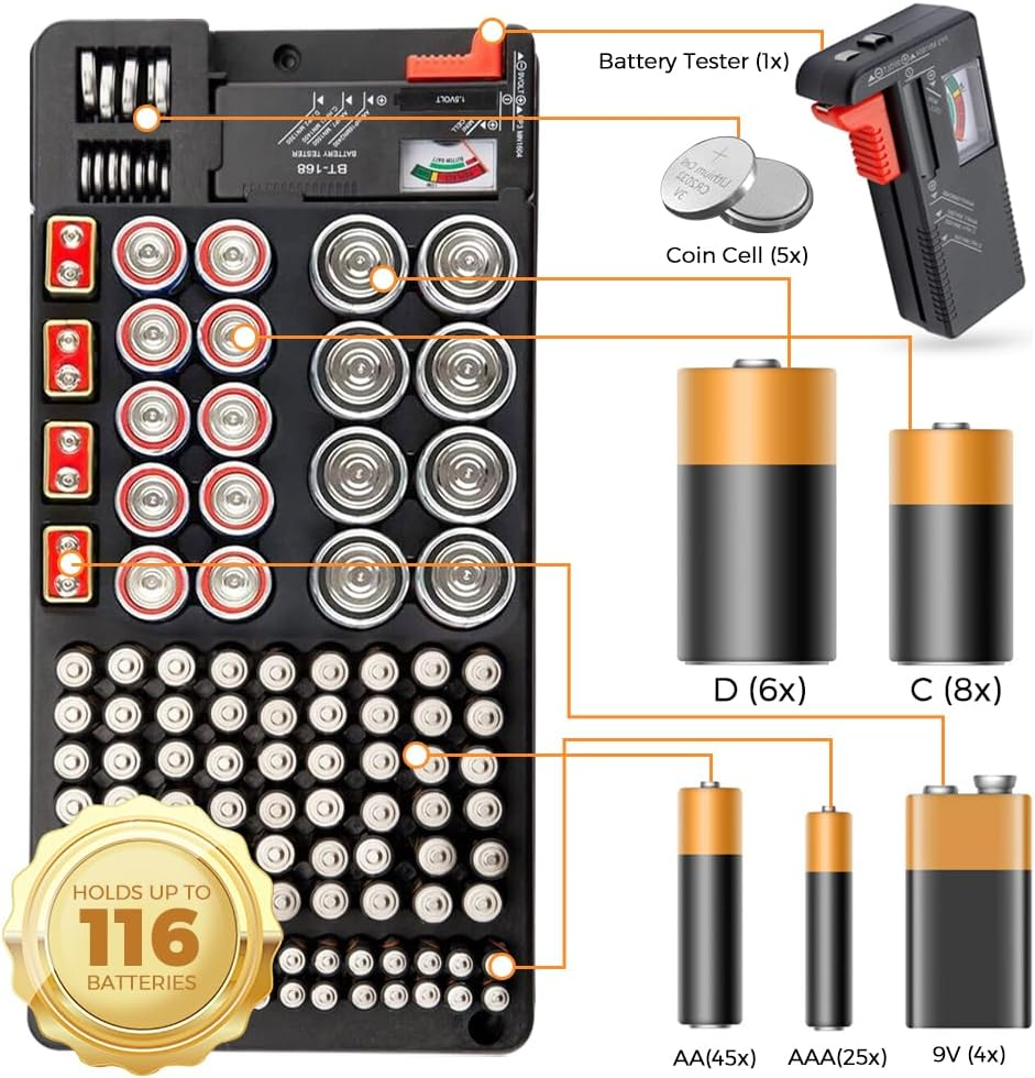 - Massive 116 Battery Capacity: Stores AAA, AA, C, D, and 9V batteries in dedicated slots for superior organization.