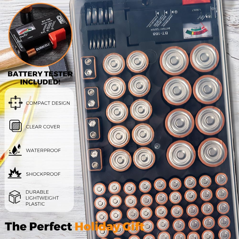 Organize, protect, and test your power cells with this high-capacity Battery Storage Case and Organiser. Designed to hold up to 116 batteries (AAA, AA, C, D, 9V), this durable, fireproof, and waterproof box includes a digital tester to eliminate guesswork and maximize safety.
