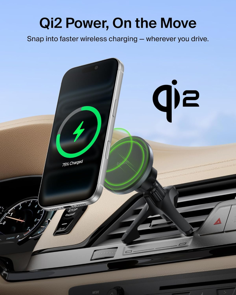 Upgrade your commute with the future of in-car charging. The Belkin BoostCharge Magnetic Wireless Car Charger combines the latest Qi2 technology with secure, MagSafe-compatible magnetic mounting, ensuring lightning-fast 15W wireless power for your iPhone 17, Galaxy S25, and PixelSnap devices. Designed for maximum convenience and safety, this versatile mount works seamlessly on both your car vent or dashboard, holding your phone firmly in place for hands-free navigation and calls. With a sleek black finish and a robust, sustainable design, it’s the essential travel accessory for anyone needing reliable power on the move. Stop fumbling with cables and start driving with the perfect blend of performance, stability, and fast charging efficiency.