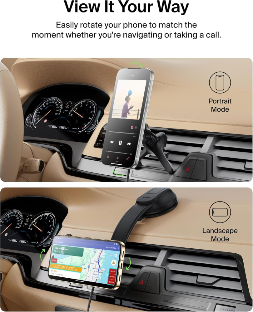 - Portrait or Landscape View: Effortlessly rotate your phone 360° for perfect viewing angles during GPS navigation or music streaming.
