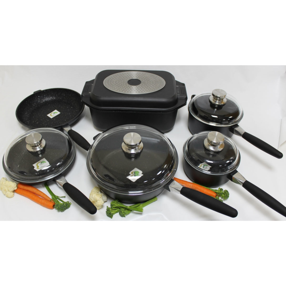 • Set includes various sizes of frying pans, saucepans, and a casserole pot.
