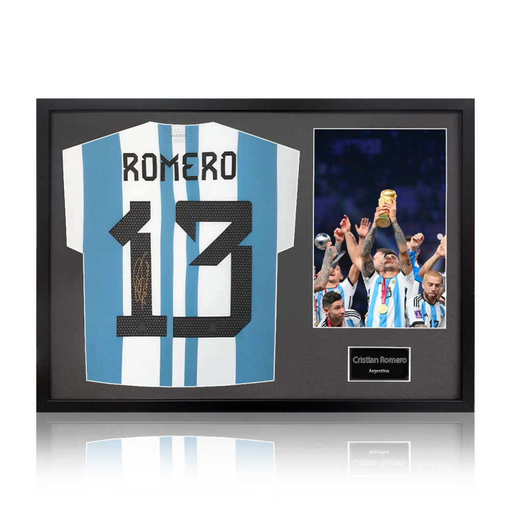 Own a Piece of History: Christian Romero Signed Framed Argentina Football Shirt – Includes Exclusive Photo & White Mount