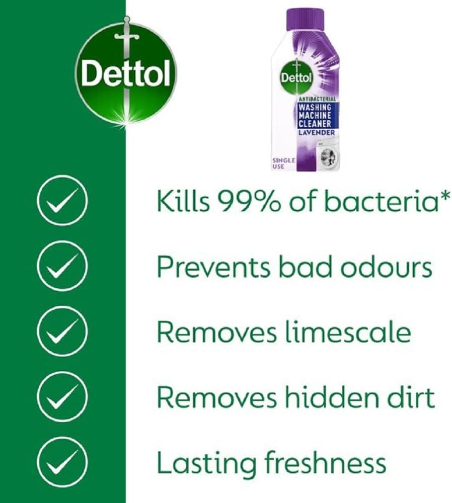 Transform your laundry experience with the Dettol 5in1 Single Use Lavender Washing Machine Cleaner. Engineered to tackle the hidden dirt, limescale, and detergent residue that builds up over time, this powerful 250ml solution ensures your washing machine runs efficiently and leaves clothes smelling fresher. Our 5-in-1 formula deep cleans five critical areas: removing limescale from heating elements, eliminating hidden dirt, killing 99.9% of bacteria, neutralizing bad odors, and delivering a long-lasting, soothing Lavender fragrance. Regular use of this single-dose cleaner protects your appliance, extends its lifespan, and guarantees hygienic results, making it an essential purchase for every modern household focused on clean, worry-free laundry.