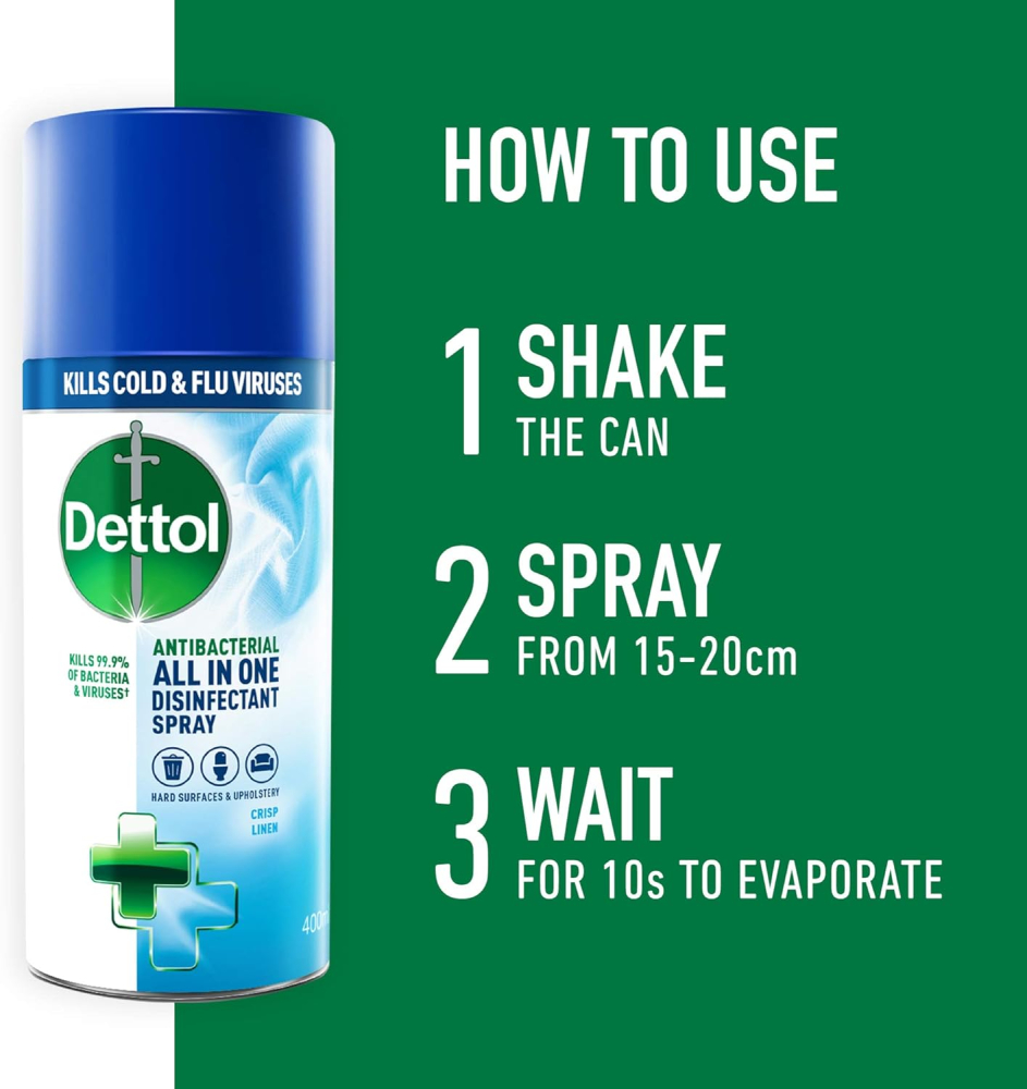 Dettol All-in-One Disinfectant Spray: Crisp Linen Scent, Total Protection (400ml)