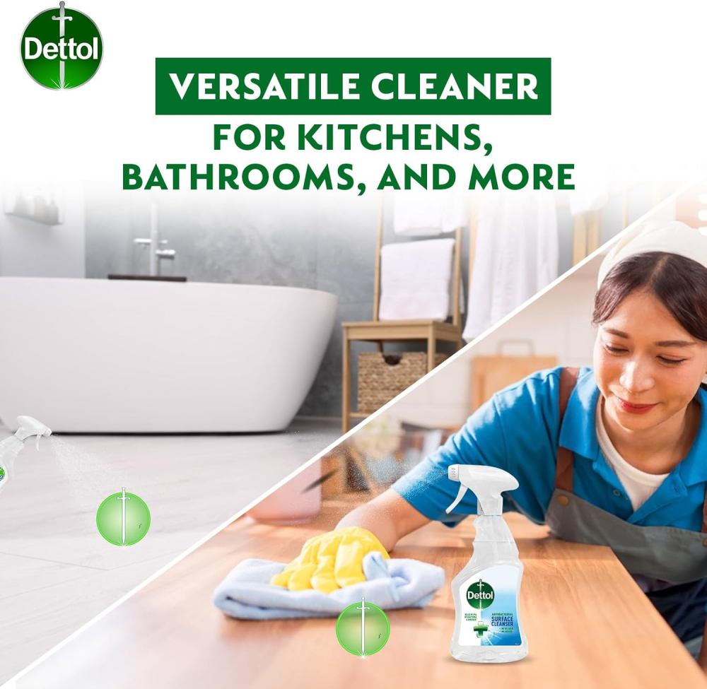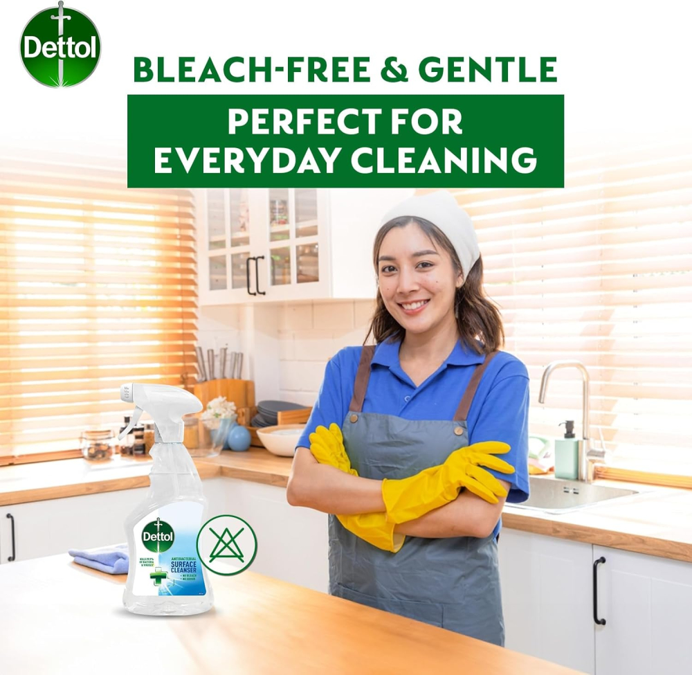 Unleash superior clean and powerful protection with the Dettol Anti Bacterial Surface Cleanser (500ml). This essential non-bleach, no-taint formula is expertly designed to kill 99.9% of bacteria and viruses, including common household threats like E. coli, Salmonella, MRSA, and the flu virus. Perfect for modern, hygiene-conscious homes, this 500ml trigger spray delivers immediate, effective sanitization across all hard surfaces. Its unique non-taint formulation makes it safe to use where food is prepared, providing peace of mind in your kitchen, bathroom, and throughout the entire home. Achieve a truly clean, healthy environment with a powerful cleanser trusted worldwide.