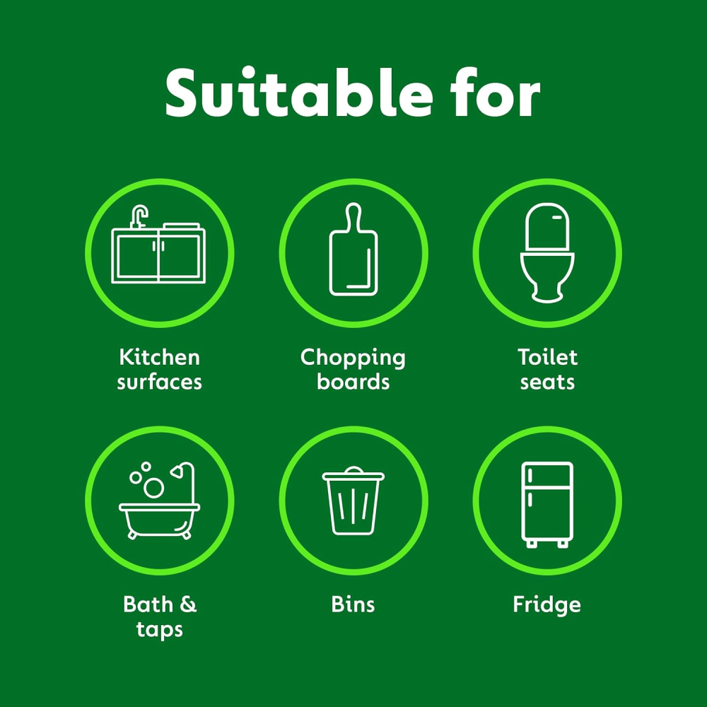 - All-Purpose Disinfectant: Ideal for cleaning kitchen surfaces, fridges, sinks, taps, doorknobs, baby equipment, and electronics.