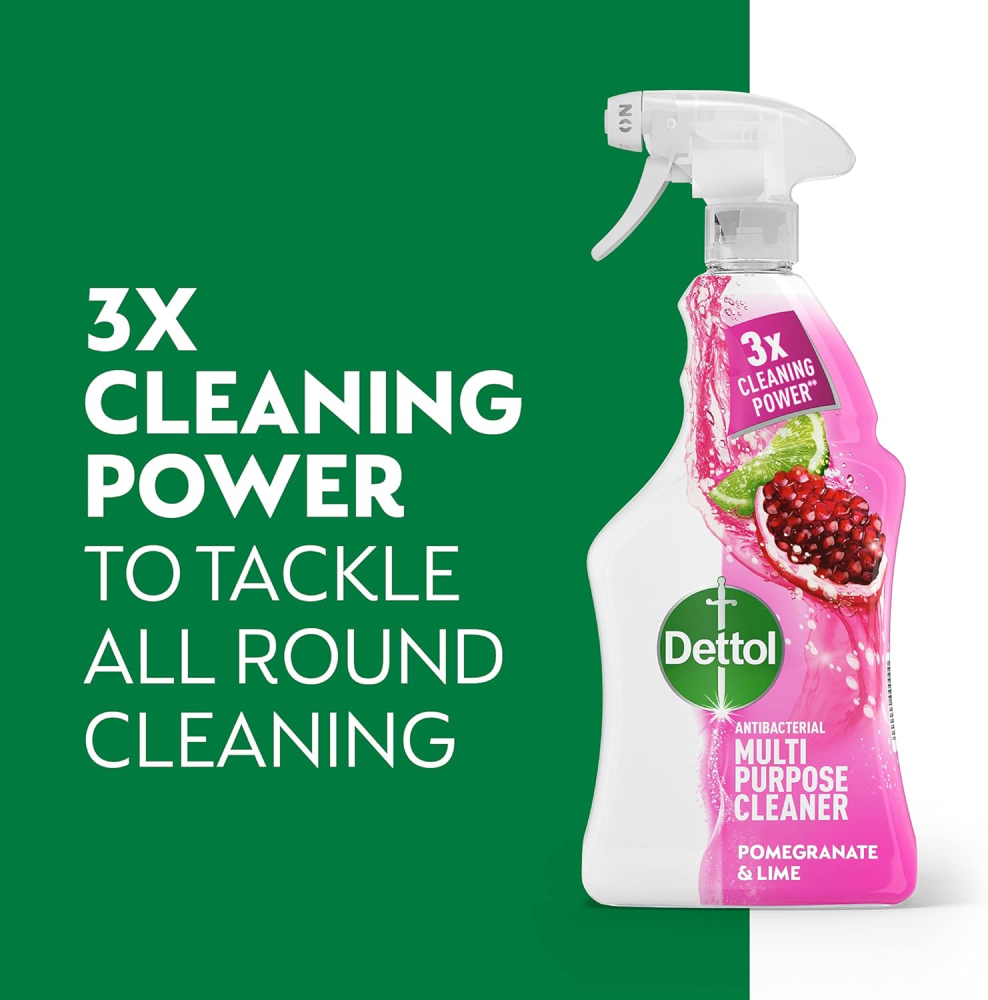 Get the Dettol Antibacterial Multipurpose Cleaning Spray in this convenient 3 x 1L pack for ultimate home hygiene. Engineered with 3X cleaning power, this spray eliminates 99.9% of bacteria and viruses, cutting through tough kitchen grease and burnt-on food, all while leaving an invigorating Pomegranate and Lime Burst scent.