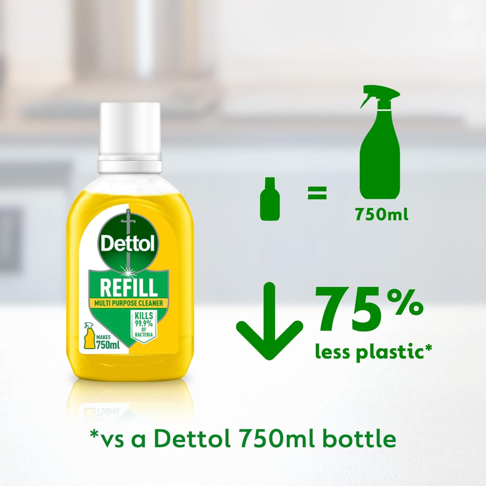 Transform your cleaning routine with the Dettol Cleaner Spray Refill Multipack, offering unparalleled value and potent germ-killing action. This exclusive pack includes 6 concentrated 50ml refills (300ml total), engineered to mix with water and create six 750ml bottles of ready-to-use antibacterial spray—that’s 4.5 litres of cleaning power! Perfect for the kitchen and all household surfaces, our advanced formula Kills 99.99% of Germs, providing essential protection for your family. Enjoy the refreshing, invigorating Citrus scent as you effortlessly disinfect and eliminate tough messes. Choose Dettol for trusted household cleanliness, now in an eco-friendly, space-saving concentrated format.