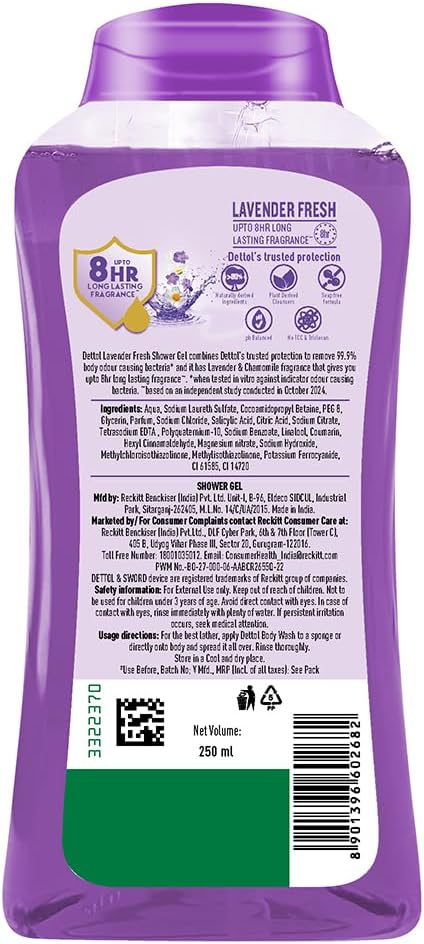 Dettol Lavender Fresh Body Wash and Shower Gel, 250ml, 8-Hour Fragrance