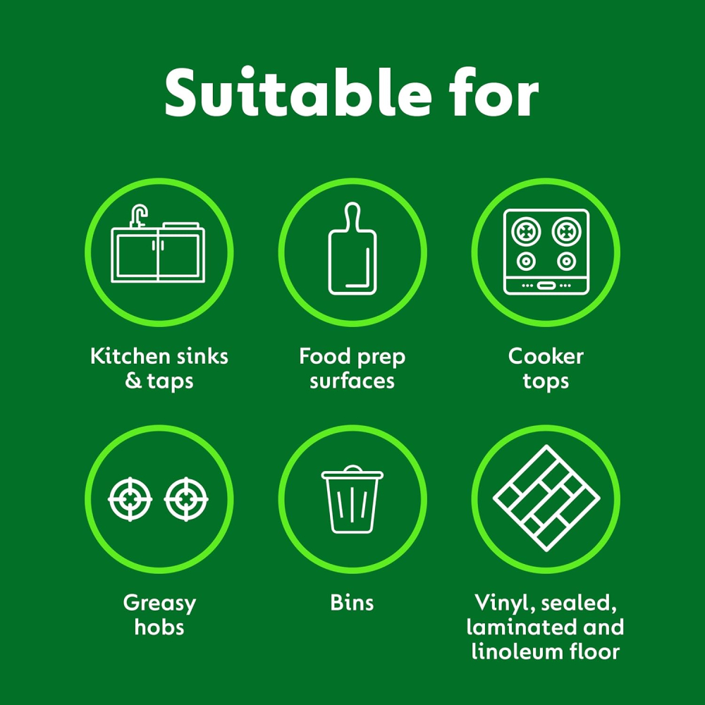 - Multipurpose formula suitable for sinks, taps, work surfaces, cooker tops, and sealed floors.