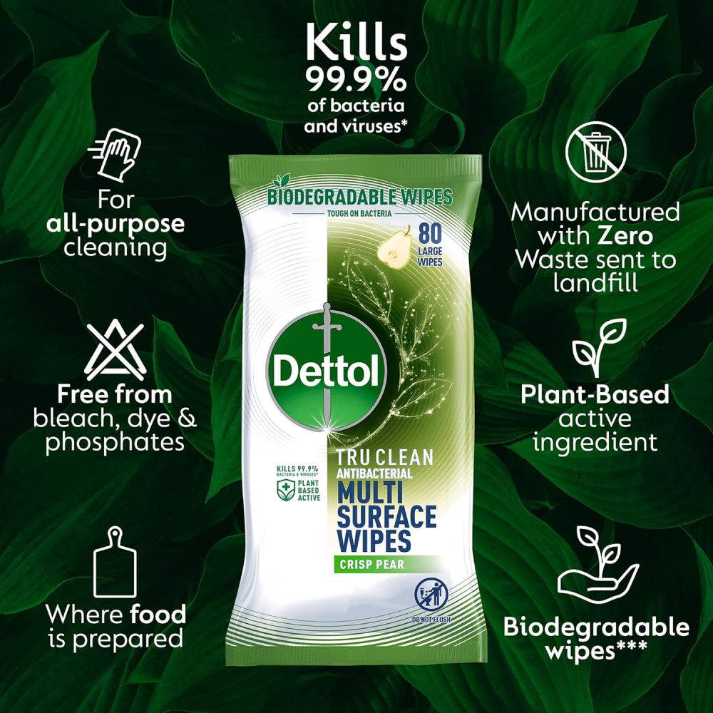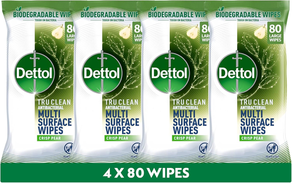 Elevate Your Clean: Dettol Tru Clean Crisp Pear Antibacterial Wipes (4x80s) – Kills 99.9% of Germs with 100% Biodegradable Fibres
