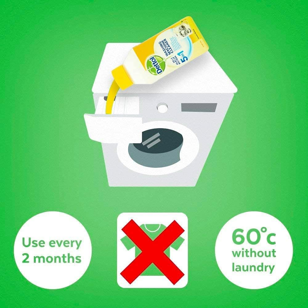 Dettol Washing Machine Cleaner (6 x 250ml) is the ultimate solution for maintaining a hygienic and highly efficient washing machine. Over time, limescale, dirt, and hidden bacteria build up in your machine’s pipes, drum, and seals, leading to foul odors and poor washing performance. This powerful, deep-cleaning formula is specifically engineered to eliminate 99.9% of bacteria and remove performance-inhibiting limescale and detergent residue, ensuring your machine runs optimally and your laundry comes out truly clean and fresh. The convenient 6-pack of 250ml bottles provides a half-year supply, giving you six powerful doses for six months of guaranteed washing machine hygiene. Experience the difference a professionally cleaned machine makes with a refreshing Lemon scent.