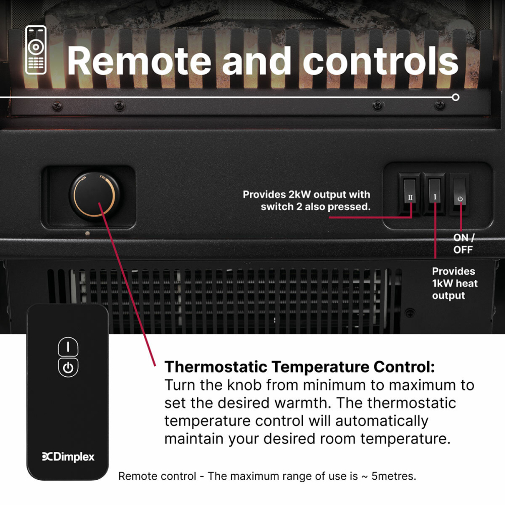 • Adjustable Controls: Integrated thermostat and remote control for easy management of heat output and flame brightness.