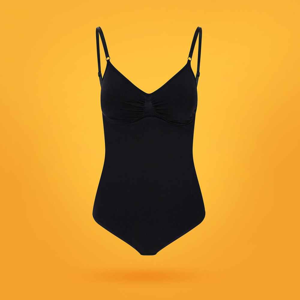 The Evenlina Sculpting Shapewear Bodysuit in Noir instantly redefines your figure, using breathable, medium compression to smooth the midsection and sculpt curves. This luxurious, seamless black foundation garment provides superior bust support for a flawless and invisible look under any clothing. Experience ultimate comfort and confidence with this daily-wear shaping solution.