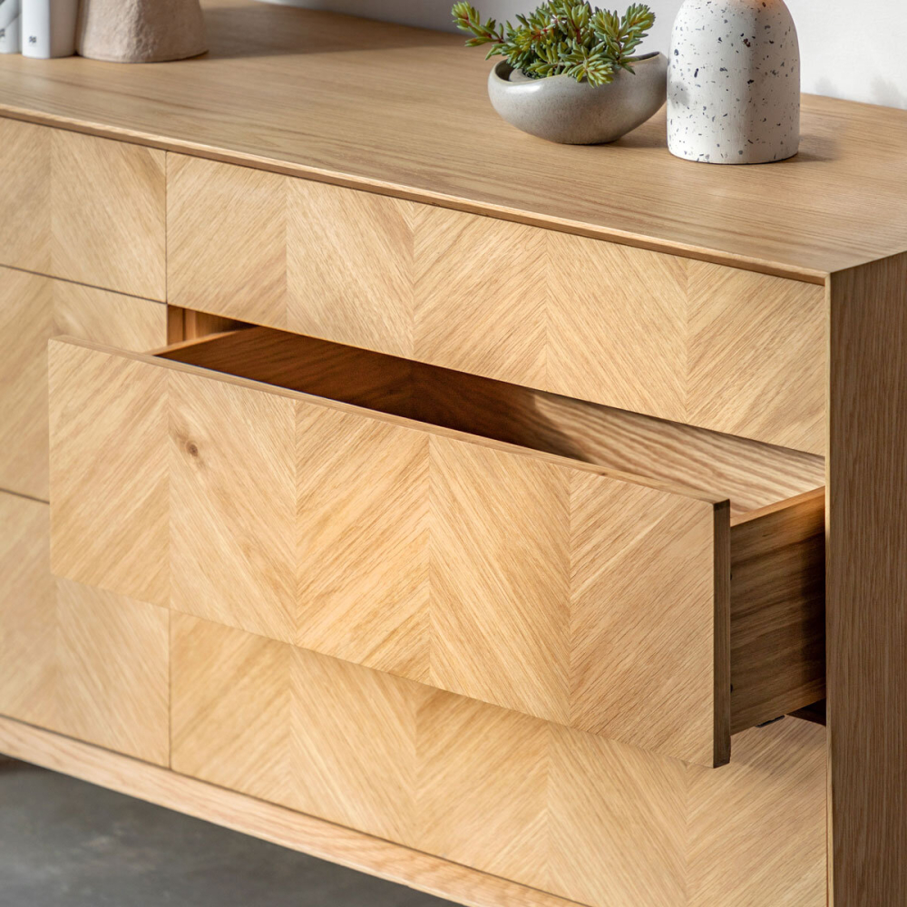 Instantly elevate your home with the Gallery Milano Oak 6 Drawer Chest of Drawers, a premium storage solution blending rustic elegance with modern functionality. Crafted from solid oak and veneers, this chest features six spacious drawers on smooth runners, offering superior organization and a timeless natural wood aesthetic for any bedroom.