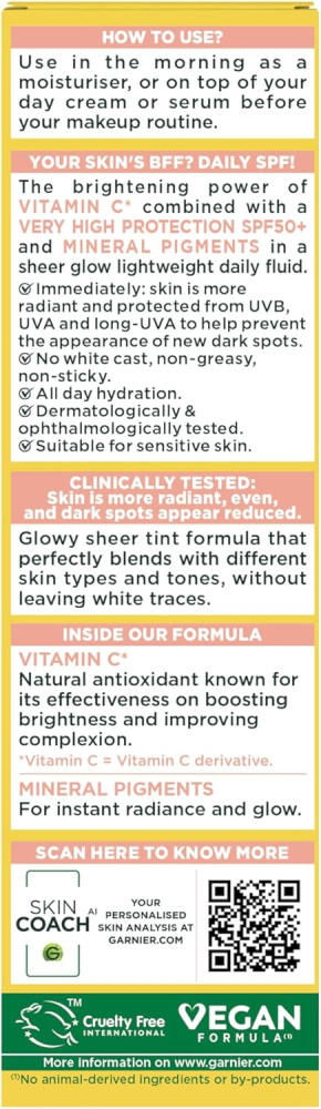 Garnier Vitamin C Daily UV Brightening Fluid Sheer Glow, SPF50+, Prevents + Corrects Sun Damages + Evens Skin tone, Face & Neck, For all skin types, Cruelty-Free, Vegan, 40ml