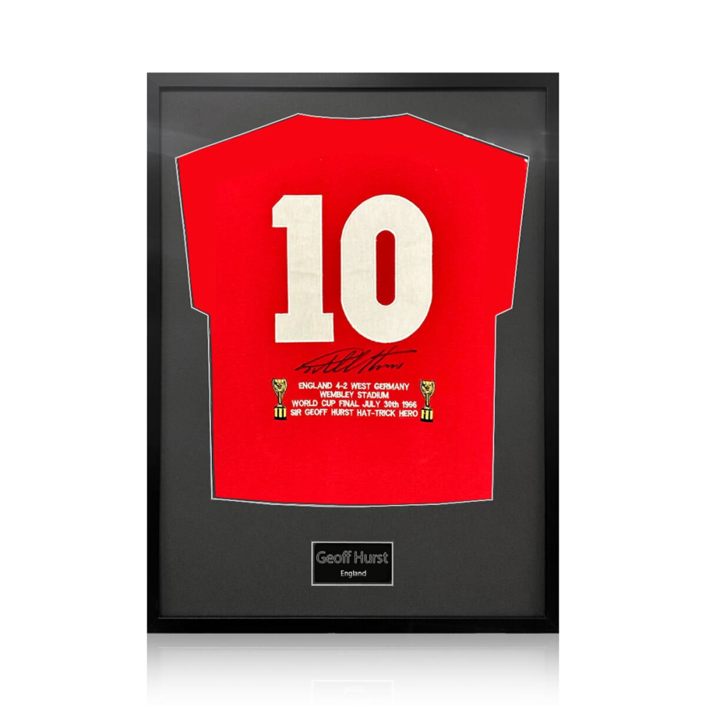 Own a Piece of History: Authentic Geoff Hurst Signed Framed England 1966 World Cup-Style Football Shirt with White Mount – Investment Grade Memorabilia