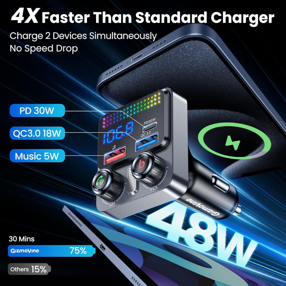 GizmoVine Bluetooth 5.4 FM Transmitter for Car, 48W Car Charger [PD 30W & QC3.0 18W], 3 Ports, Wireless Radio, Deep Bass, Hands-Free Calls, Voice Assistant, USB Play, Neon Lights, 12V/24V