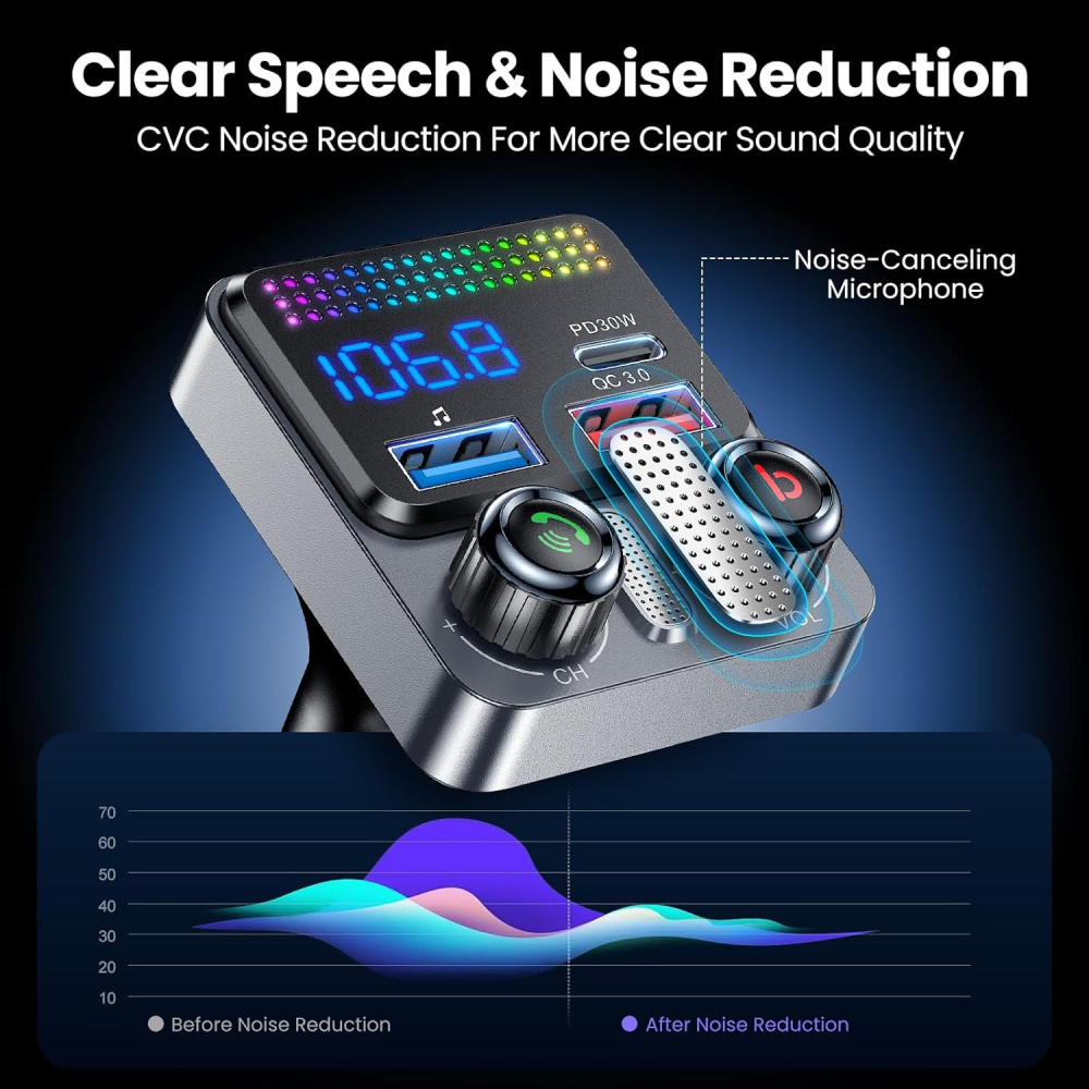 Upgrade your vehicle instantly with the ultimate 3-in-1 GizmoVine Bluetooth 5.4 FM Transmitter for Car. This powerful car accessory combines lightning-fast 48W charging, crystal-clear wireless audio streaming, and secure hands-free calling, making every drive safer and more entertaining. Featuring cutting-edge Bluetooth 5.4 technology, you get rock-solid, one-second pairing and an ultra-stable connection, even on the roughest roads. Tired of flat sound? Activate the Deep Bass mode with a single button and turn your car speakers into a powerful, hi-fidelity sound system. Keep all your devices charged simultaneously with three intelligent charging ports: a blazing-fast PD 30W port for rapid phone and tablet charging, and dual QC3.0 18W ports. Safety is paramount: the built-in CVC Noise Cancellation microphone ensures your hands-free calls are always clear, and integration with Siri/Google Assistant offers seamless voice control. Designed for universal compatibility with all 12V/24V vehicles, this transmitter also features customizable neon ambient lights to match your interior, making it the essential gadget for the modern driver seeking speed, sound, and style.