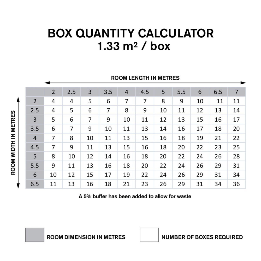 • Each pack covers 1.33 m² (14.3 sq ft).