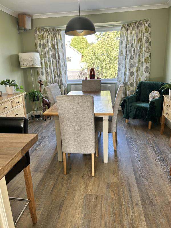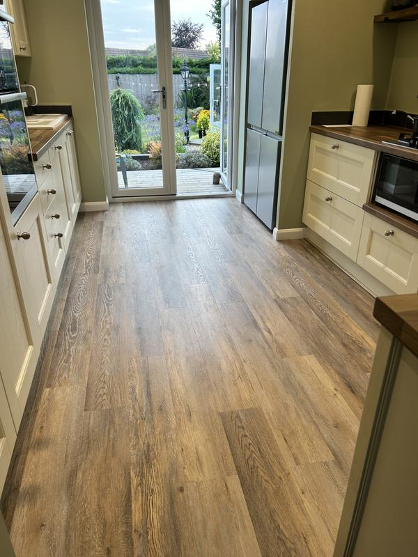 This flooring is excellent quality and the planks fit together beautifully. The colour is slightly darker than expected but the finished effect is lovely, an attractive “wood” floor with all the benefits of vinyl – hard wearing, water resistant, will not expand and contract or fade in the sun.