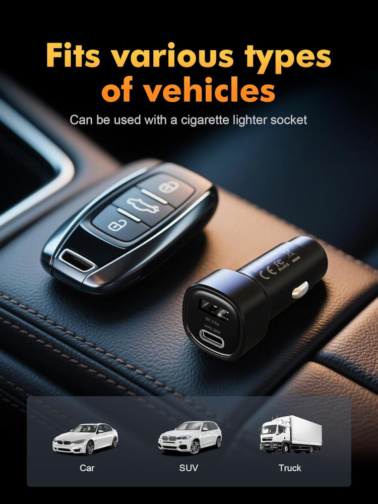 Never run out of power on the road again! The GRIFEMA 48W Dual-Port Car Charger is the ultimate power solution for commuters, travelers, and tech enthusiasts. Engineered to deliver blazing-fast charging, this sleek cigarette lighter adapter features a powerful 30W Power Delivery (PD) USB-C port and an 18W Quick Charge 3.0 (QC 3.0) USB-A port, allowing you to charge two devices simultaneously at their optimal speed. Safely power up the latest flagship phones like the iPhone 16, 15, 14, and 13 Pro Max, as well as high-power devices like the Samsung Galaxy S25/S24 Ultra and tablets, ensuring you spend less time charging and more time driving. Its compact, heat-resistant design fits perfectly in any 12V or 24V vehicle socket, offering robust protection against short circuits and overcharging for peace of mind on every journey.