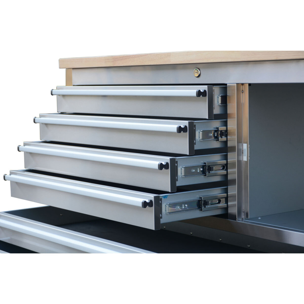Transform your garage or workshop into a professional-grade space with the Hilka 48″ Stainless Steel Tool Cabinet. This heavy-duty, 6-drawer roller cabinet is the definitive solution for secure tool storage and efficient organization. Engineered with durable, anti-fingerprint stainless steel, it guarantees longevity and a pristine appearance. The cabinet features precision ball-bearing drawer slides for smooth operation, ensuring effortless access to all your equipment. Topped with a substantial 30mm thick rubber wood worktop, it provides a robust and functional surface for all your projects. Maximize your productivity and secure your valuable tools with this essential piece of premium workshop furniture.