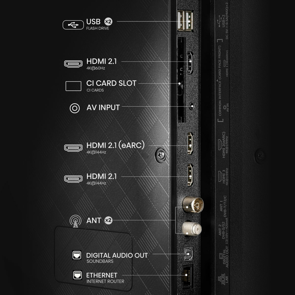 3 x HDMI (3 x 2.1)(eARC HDMI 3), 2x USB, 1x CI Slot, 2x RF in, 1x LAN, 1x SPDIF (Optical Digital Audio Out), 1 x Headphone Out |