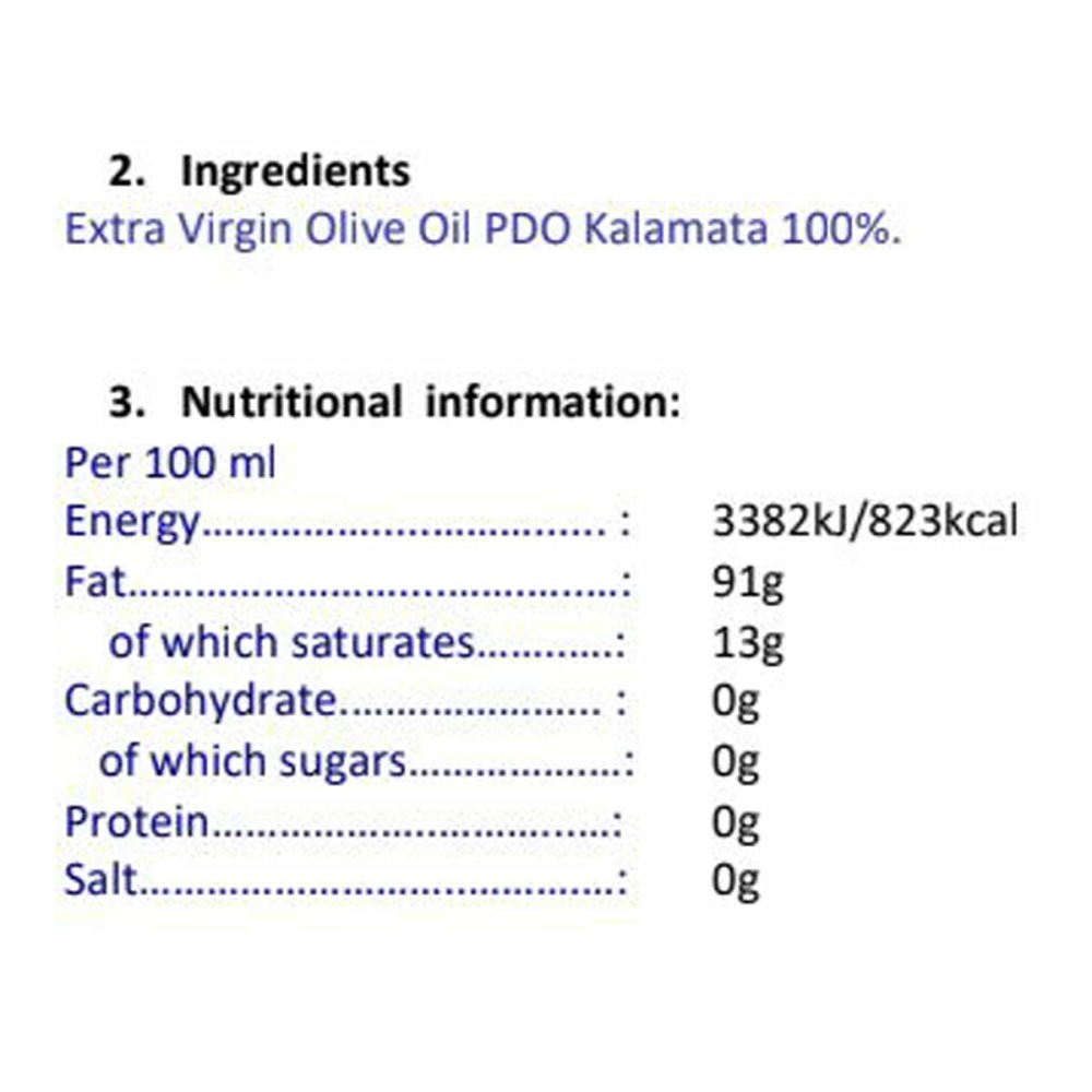- Ingredients: 100% Kalamata PDO Extra Virgin Olive Oil.