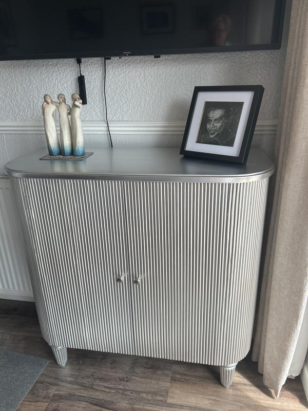 The Jeeves Silver Drinks Cabinet is the ultimate modern bar storage solution, instantly transforming any space into a sophisticated home entertainment area. This high-end contemporary bar cabinet features a sleek silver finish, geometric detailing, and a compact footprint, making it a perfect statement piece for organized storage of spirits and glassware.