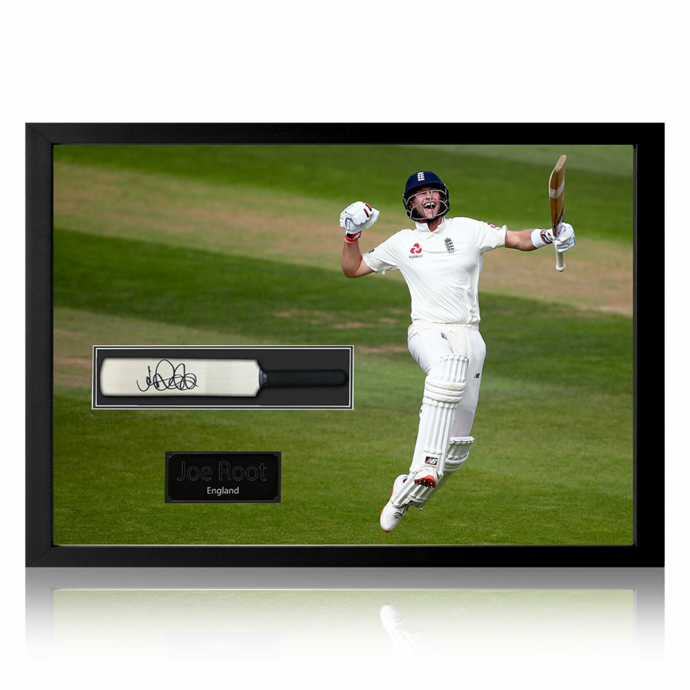 Joe Root Signed Framed Mini Cricket Bat with Celebration Design
