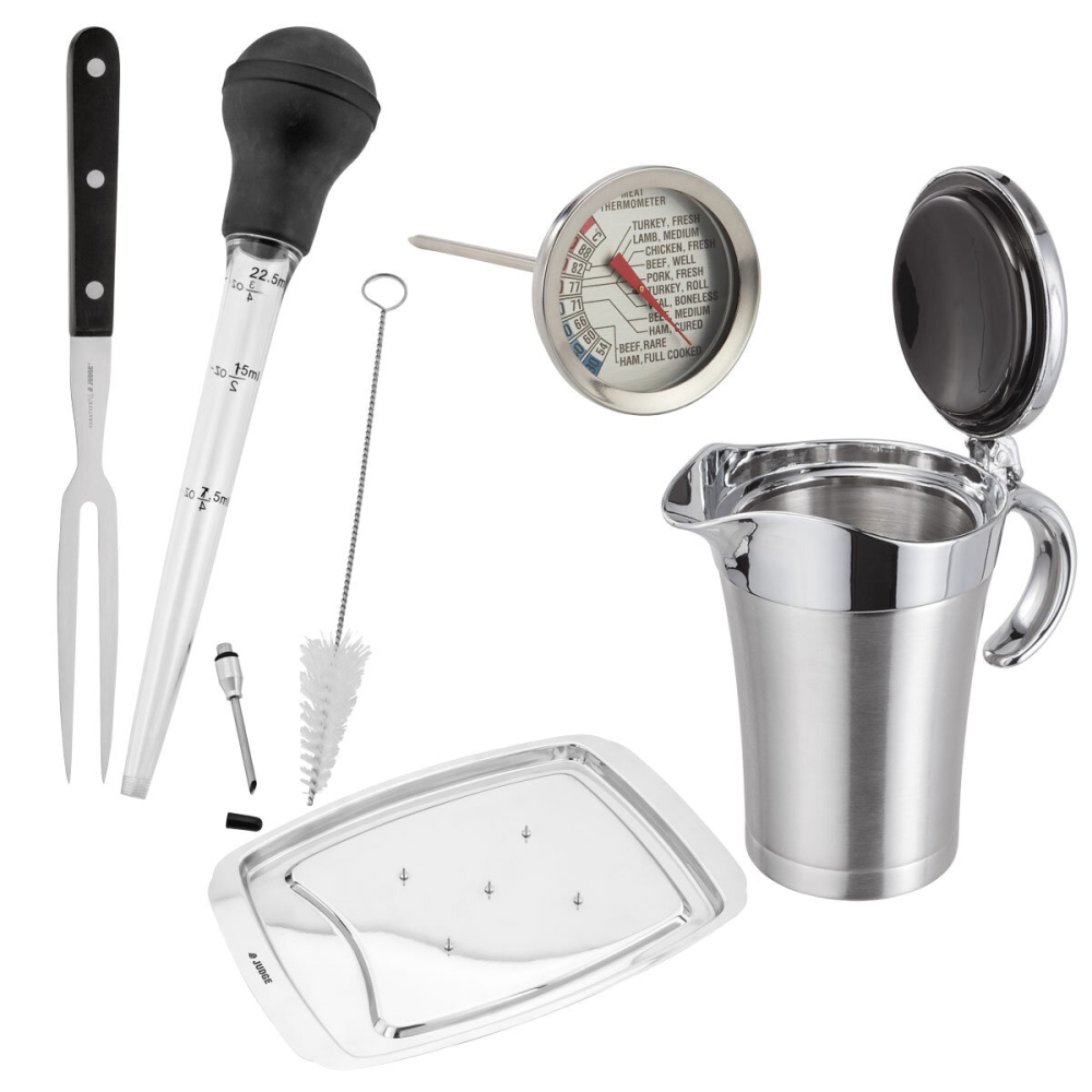 - All-in-One Roasting Kit: Includes meat thermometer, baster, carving tray, fork, and gravy pot.