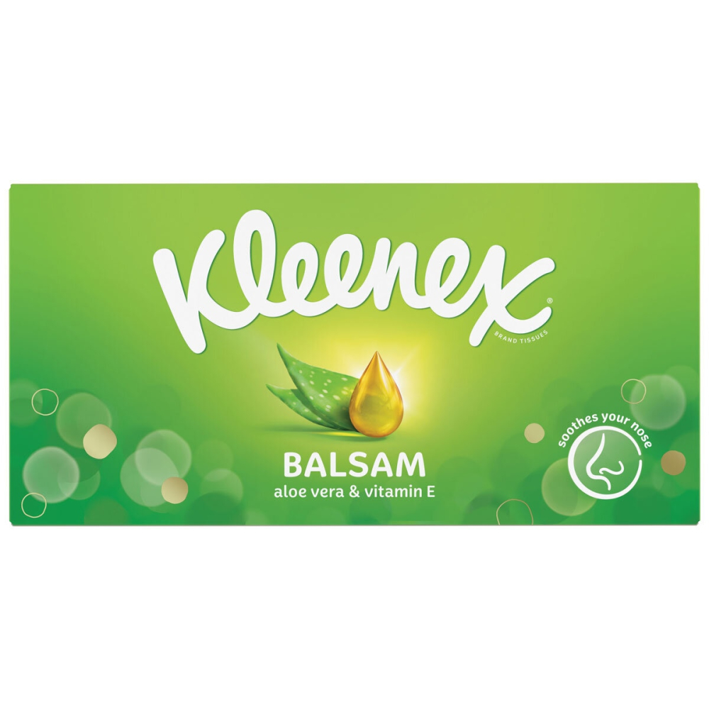 Stop the sore nose cycle with Kleenex Balsam Tissues, the ultimate 6-pack bulk value offering 384 soothing tissues infused with Aloe Vera and Vitamin E. These dermatologically tested, 3-ply tissues provide superior comfort and help prevent the irritation and chapping caused by repeated blowing during cold and flu season.