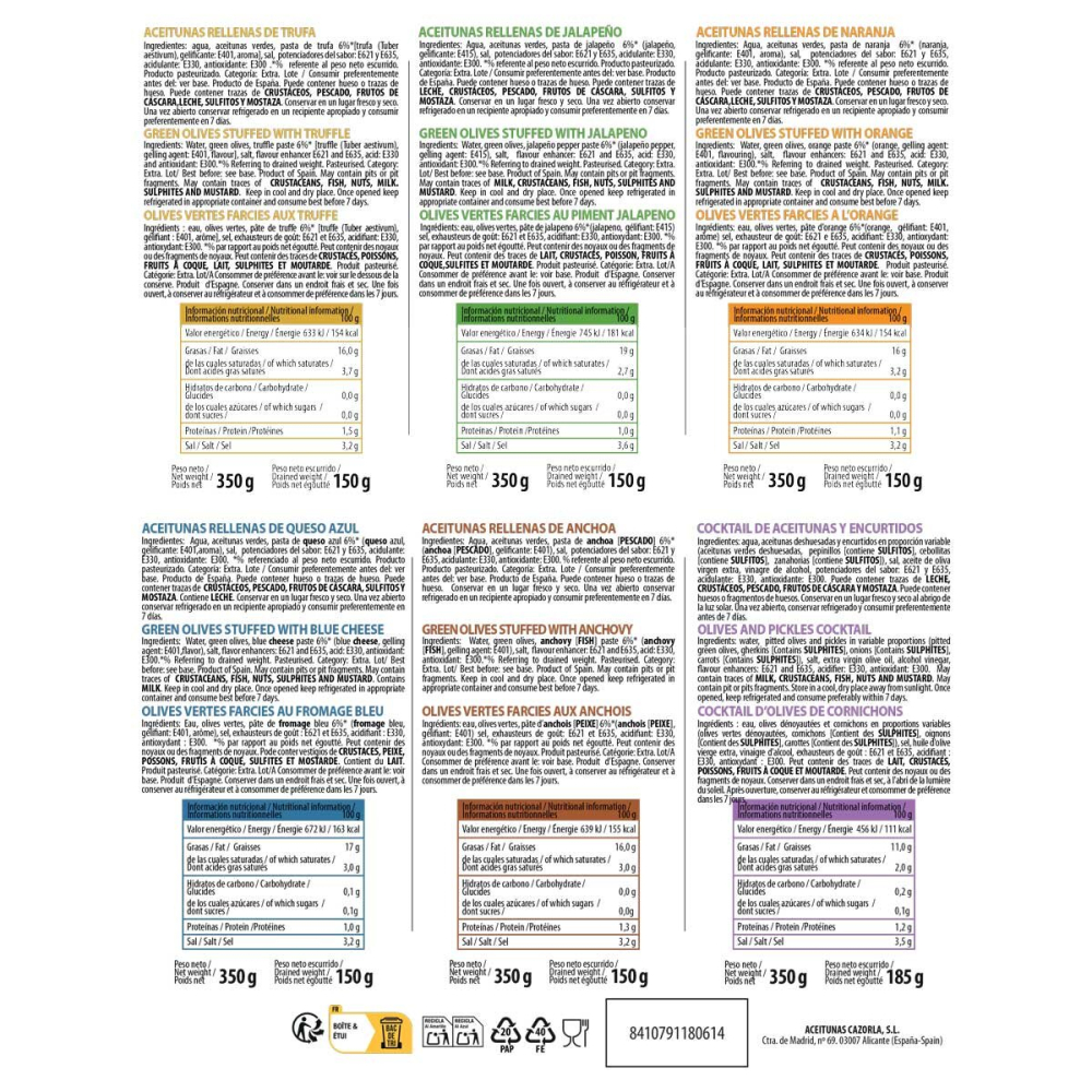Really nice olives. The anchovies ones are stuffed with them, all the rest are flavoured.