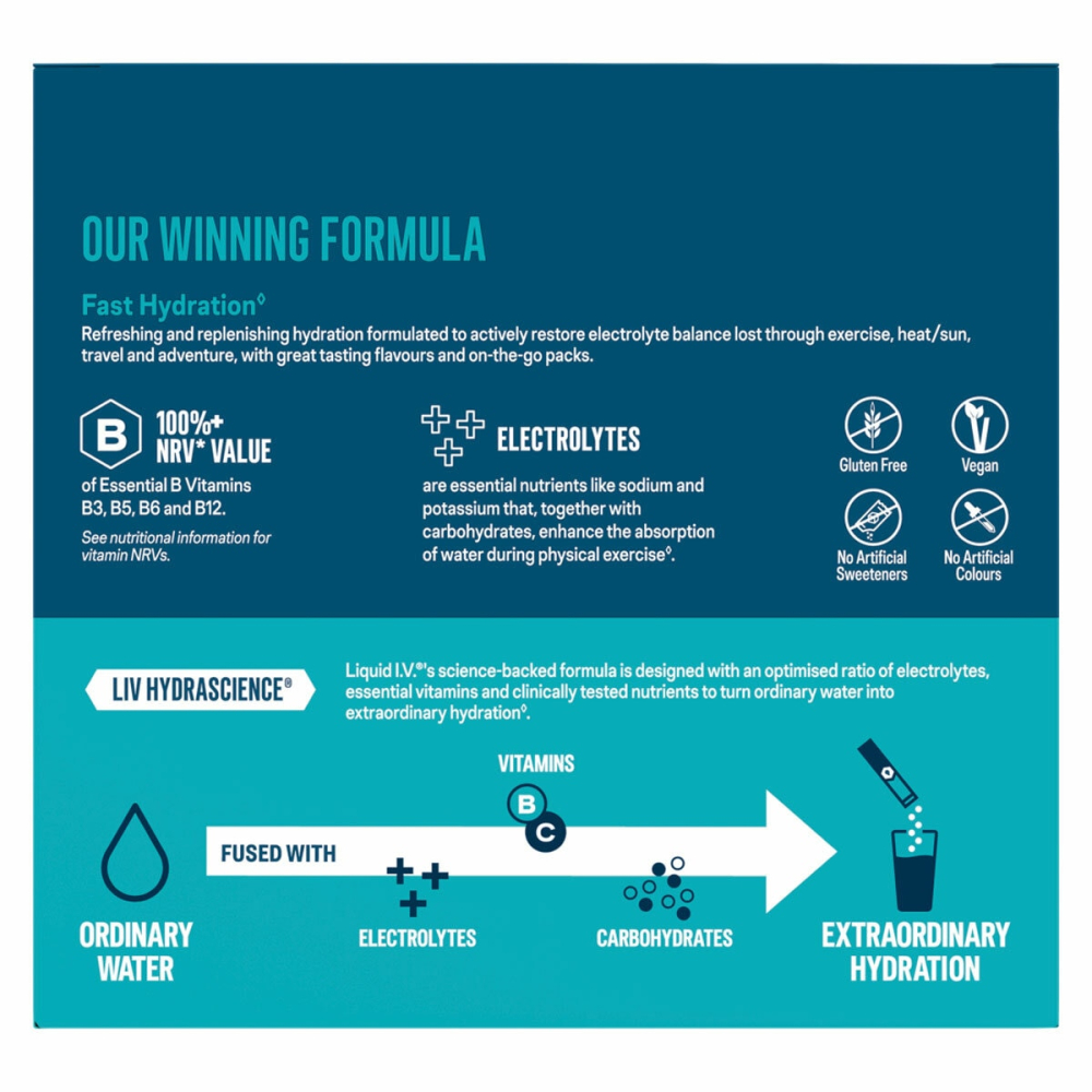 - Electrolyte Rich formula with 7 essential vitamins (B3, B5, B6, B12, C).