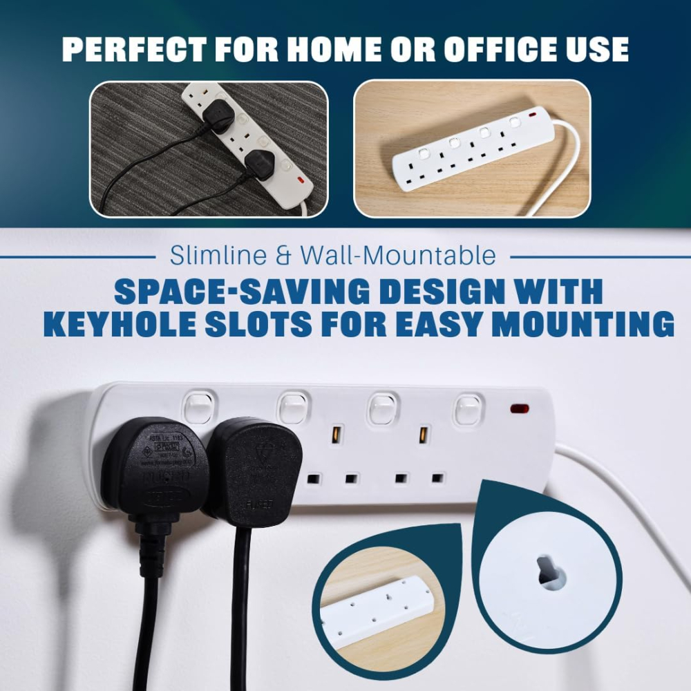 Upgrade your power setup with the ultimate Mercury 4-Gang Individually Switched Extension Lead. Designed for modern homes and professional workspaces, this white multi-socket power strip offers exceptional control, safety, and energy efficiency. Stop wasting standby power; each of the four UK sockets features its own neon-lit individual switch, giving you complete command over connected devices like computers, home entertainment systems, and kitchen appliances. The durable 2-meter cable provides flexible reach, while the slimline, wall-mountable design (with integrated keyhole slots) keeps your space tidy and organized. Certified to UK safety standards, this extension lead is the smart, secure solution for managing multiple power needs effortlessly.